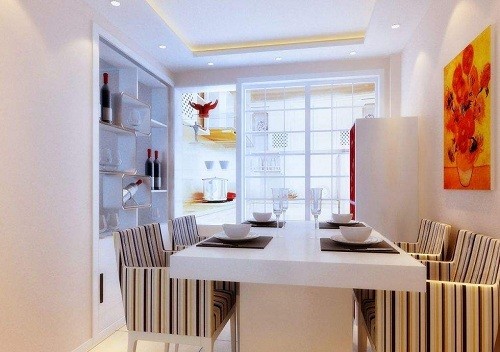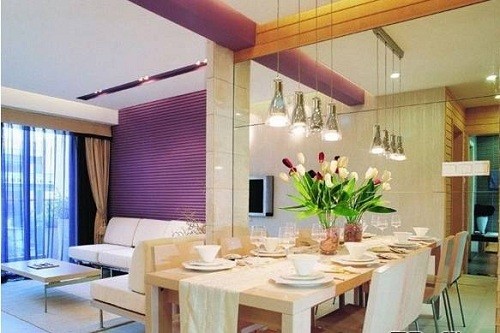 其次就是餐廳色彩的選搭:餐廳的色彩應(yīng)以明快為主,明快的顏色能讓人感覺到和煦的溫暖,同時還能增加食欲,所以在餐廳裝修時,我們不妨多運用一些橙色系,黃色系的色塊,容易讓人有眼前一亮的感覺。不過裝修過的人都知道,如果全部采用亮色,無疑會讓空間顯得狹小而逼仄,所以在使用亮色時,也要適當?shù)挠靡恍├渖{(diào)來加以補充。全部明亮的色調(diào)會讓人覺得焦躁而壓抑。另外,如果餐廳與臥室相連,就要考慮到餐廳一臥室之間的協(xié)調(diào)性。