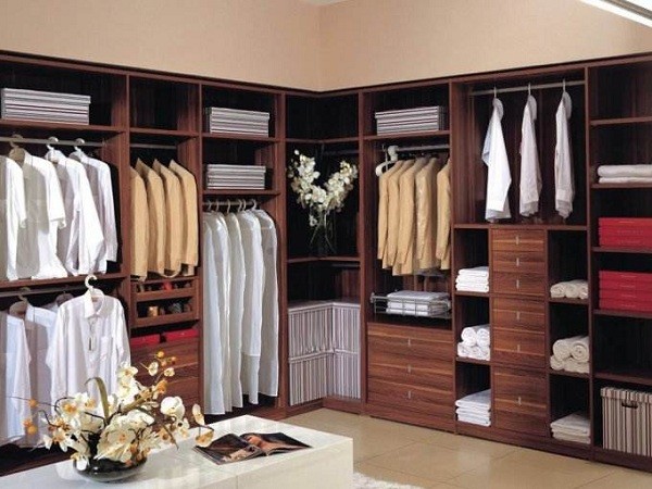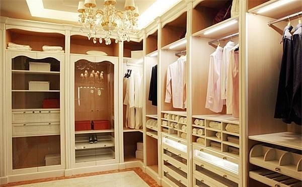 衣帽間可以根據(jù)主人的喜好和整體居室風格任意搭配色彩和造型,具有很大的可塑性,如果主人深顏色的衣服比較多,可以選擇淺顏色的底材進行裝修設(shè)計,如果白色衣物比較多,不妨大膽使用深色材料,如果希望衣帽間具有一定的品味,還可考慮使用壁布。