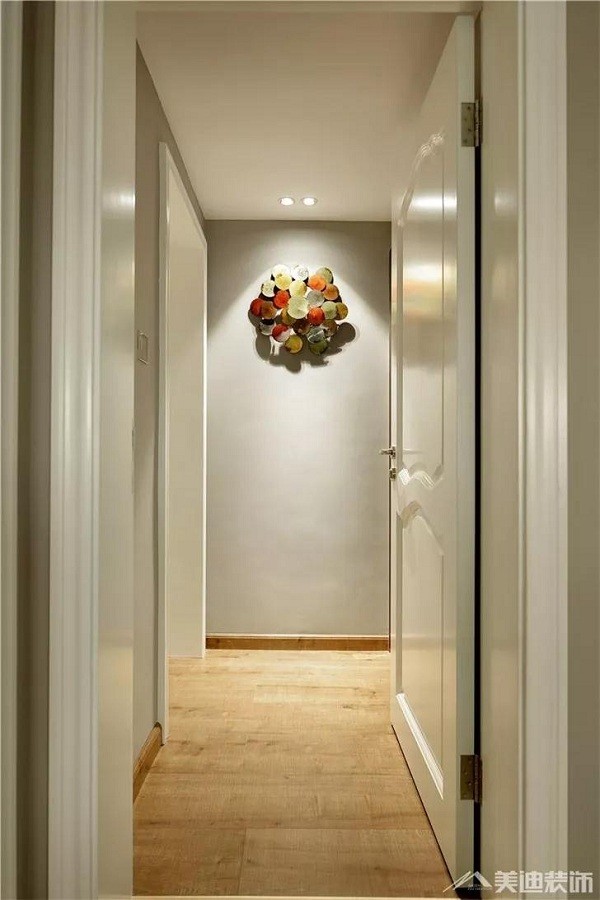 走廊通道的設(shè)計,木質(zhì)地板與白色門框以及墻壁相輔相成,墻壁上的藝術(shù)設(shè)計作品,配上頂光照射下的陰影,顯得更加柔和溫馨。