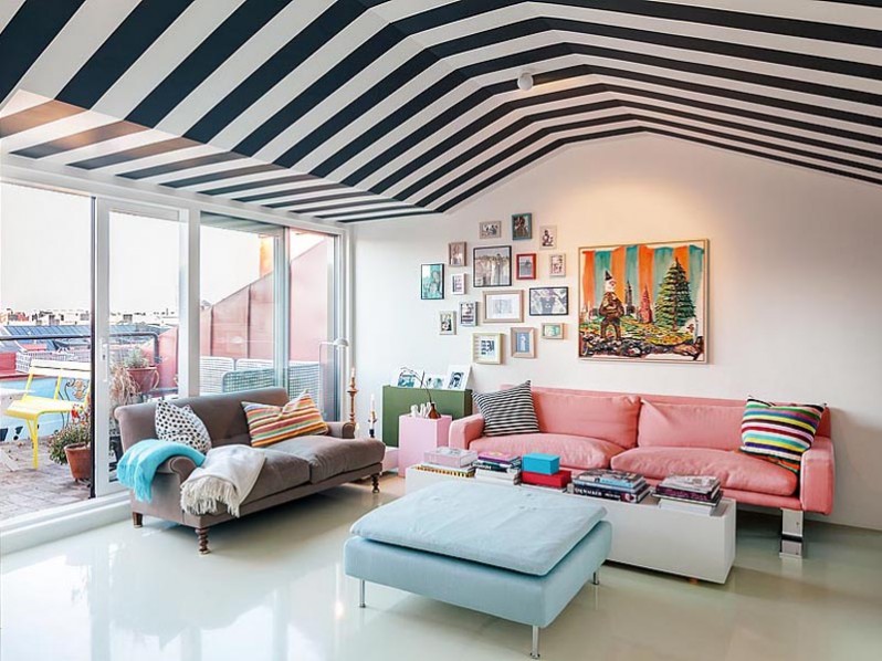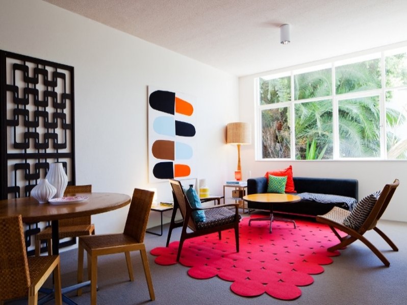 ①硬朗色系:中心色為紅色,整個居室地面鋪紅色地毯。窗簾用藍(lán)百的印花布,與紅色地毯成強(qiáng)烈對比。沙發(fā)選用黑色,家具以白色為主,墻和天花板也以白色為主,這樣就可以避免對比強(qiáng)烈而顯得刺眼。