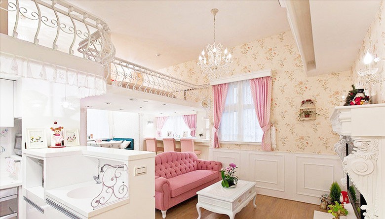 ④輕柔色系:中心色為柔和的粉紅色。地毯、燈罩、窗簾用紅加白色調(diào),家具白色,房間局部點(diǎn)綴淡藍(lán),以增添浪漫的氣氛。