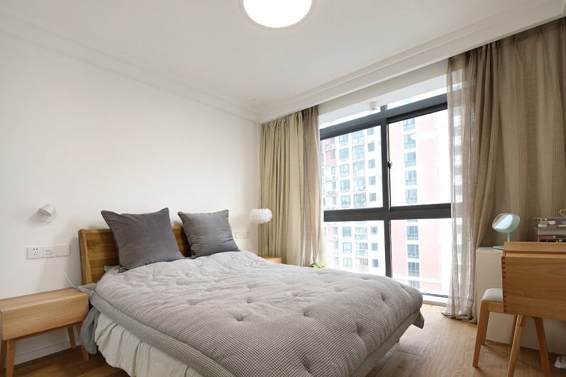 臥室的光線非常好,雙層的布藝窗簾契合了整體色調(diào),讓臥室看上去更多了安靜的感覺。臥室家具的搭配也盡量是用到了原木色,溫馨且清新。