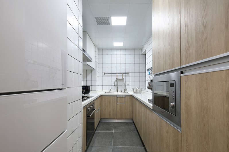 狹長的廚房空間,完美的突出了日式風(fēng)格的主題,不浪費(fèi)每一寸地方。廚房的設(shè)計(jì),讓整個(gè)空間都變的通透又寬敞起來。