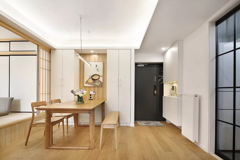 溫潤的木色與簡單的白色相搭配,營造出舒適的居家環(huán)境。玄關(guān)處裝修非常簡潔,沒有做任何設(shè)計(jì),空間上一覽無余。