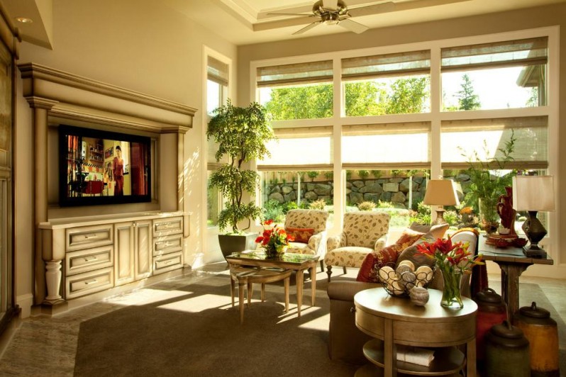 客廳作為待客區(qū)域,一般要求簡潔明快,同時裝修較其他空間要更明快光鮮,通常使用大量的石材和木飾面裝飾;眾所周知,美國的歷史較短,美國人對歷史感的要求更加高,這種要求不僅反映在軟裝擺件上對仿古藝術(shù)品的喜愛,同時也反映在裝修上對各種仿古的墻地磚、石材的偏愛和對各種仿舊工藝的追求上,總體而言,田園風格裝修的客廳是寬敞而富有歷史氣息的。