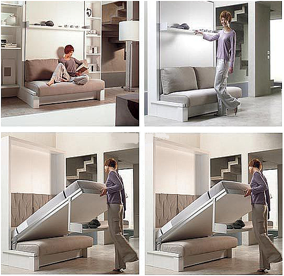 這款節(jié)省空間的創(chuàng)意家居,功能多多,我們可以從圖上看到這款家居的主體是一個壁床,白天的時候就把壁床收起來靠在墻上,床下是一個架子,推起來就正好是一個壁櫥,然后底部是一個雙人到三人的沙發(fā);到了晚上,就把壁床放下來就可以睡覺了。這是一個非常節(jié)省空間的創(chuàng)意家居,不僅有壁櫥,有沙發(fā)還有床,但是它的總體占地空間也就在4-6平方米左右,非常實(shí)用!