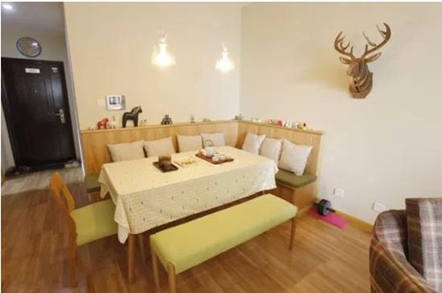 因為小戶型空間限制,所以餐廳和客廳是一體化設(shè)計,不僅提高了空間的利用率,同時也讓空間看上去比較通透寬敞,讓人感覺非常緊湊自然,非常精美溫馨??ㄗ竺媾_子上擺放著各種各樣的玩具擺件,搭配上餐廳背景墻上的鹿頭掛件,讓整間餐廳充滿情調(diào)。