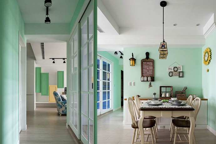餐廳以嫩綠色為主,墻面的裝飾也配合了美式風(fēng)格,壁燈和吊燈的設(shè)計(jì)也互相輝映,整體效果看上去更凸顯了風(fēng)格特色。