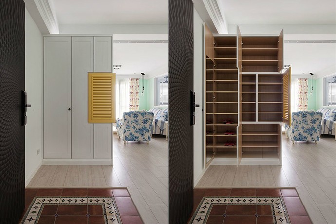 玄關(guān)的設(shè)計(jì)滿(mǎn)足了小戶(hù)型的需求,又足夠大的空間收納,在整個(gè)白色空間下加入黃色的點(diǎn)綴,設(shè)計(jì)生動(dòng)了不少。