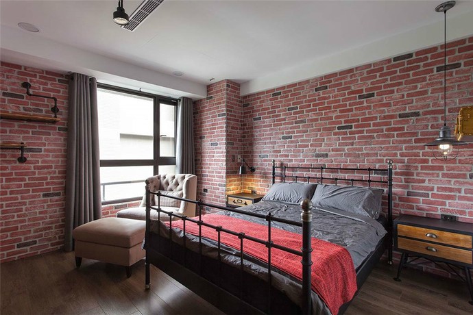 主臥的設(shè)計(jì)和整體房間色調(diào)不同,主要偏工業(yè)美式風(fēng),復(fù)古的家具和鐵藝床,個(gè)性但不夸張,非常符合年輕人的審美。