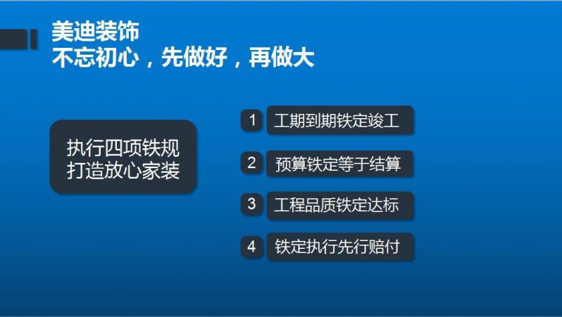 為了更有效的執(zhí)行放心家裝的標(biāo)準(zhǔn),美迪裝飾還制定了“四項(xiàng)鐵規(guī)”, 即工期到期鐵定竣工、預(yù)算鐵定等于結(jié)算、工程品質(zhì)鐵定達(dá)標(biāo)、鐵定執(zhí)行先行賠付。美迪裝飾集團(tuán)董事長鐘菊成表示:“放心家裝是我們給消費(fèi)者的結(jié)果,四項(xiàng)鐵規(guī)是保證結(jié)果我們對企業(yè)管理的要求,通過四項(xiàng)鐵規(guī)打造放心家裝,就是要讓消費(fèi)者在家裝消費(fèi)過程中擁有獲得感和安全感?!?/span>