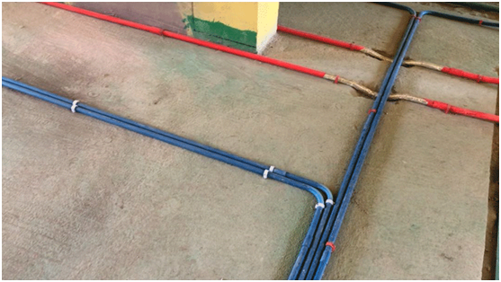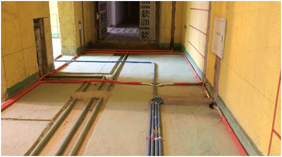 進(jìn)入室內(nèi),因是水電工程階段,最顯眼的就是各種橫平豎直的管道了。根據(jù)管道紅、藍(lán)