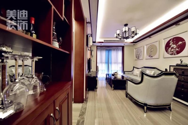 這是一張進(jìn)門照,入戶和酒柜也都是廖女士很滿意的地方,經(jīng)典色系的酒柜與整體的新中式風(fēng)格映襯得剛剛好。