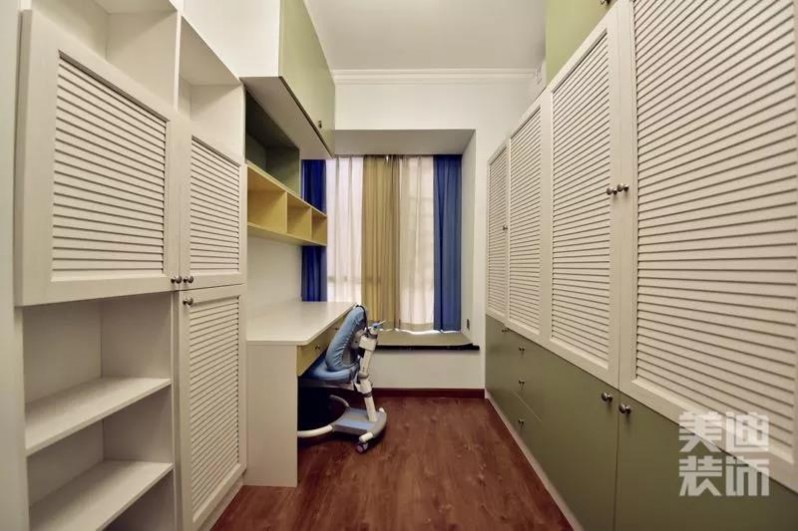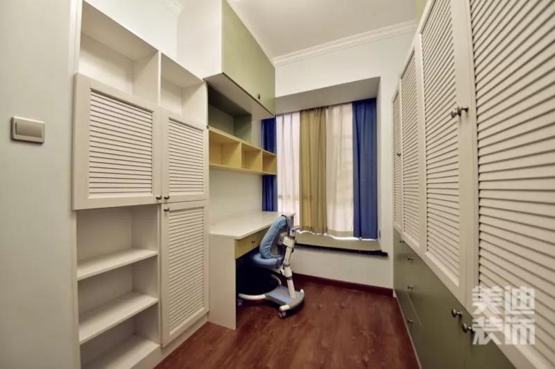這是專門為豆豆設(shè)計(jì)的書房,色系也是選擇讓人舒服的暖色調(diào)。米色書柜與淡藍(lán)色窗簾結(jié)合,動(dòng)靜結(jié)合,不失靈動(dòng)。