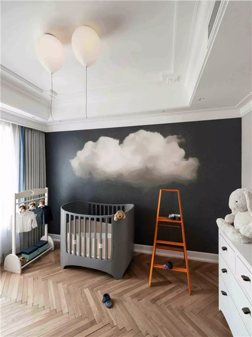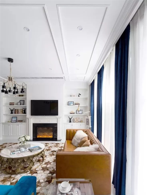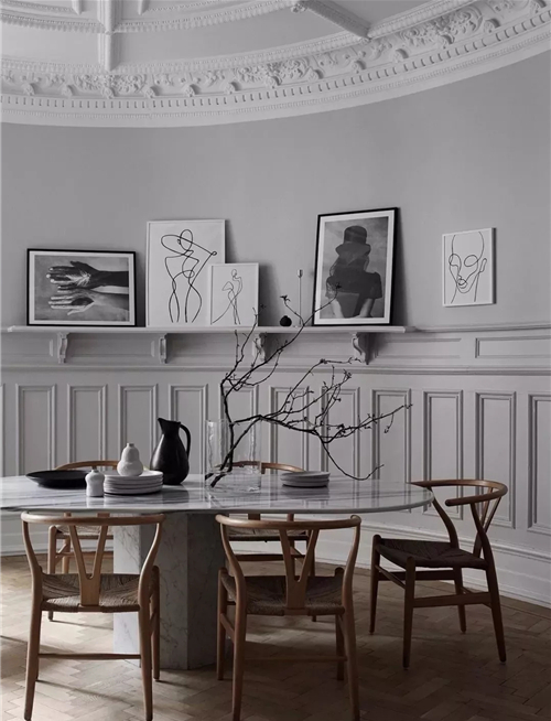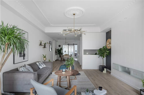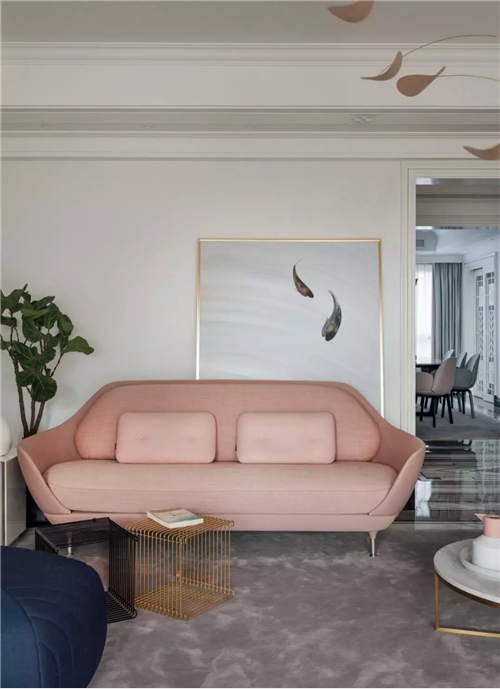 白色的石膏線在天花勾勒造型,其實(shí)很有藝術(shù)感。在硬裝時(shí)選用了花紋比較復(fù)雜精致的石膏線,那么軟裝上搭配簡練、線條流暢的現(xiàn)代家具,對(duì)比之下,就更有時(shí)髦感了。