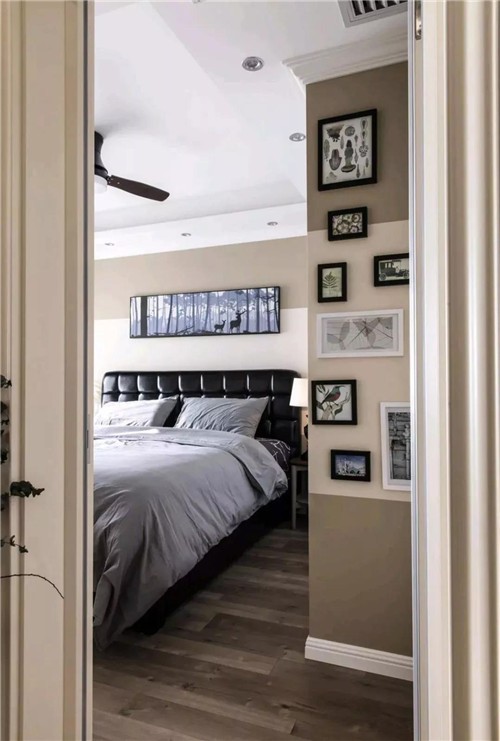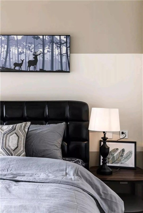 主臥的床頭靠墊是黑色皮藝的,床頭掛一幅林中小鹿裝飾畫,而臥室開門對著的這面墻則掛滿了裝飾畫,整體空間顯得格外的創(chuàng)意舒適;