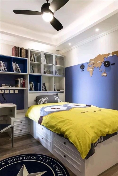 兒童房墻面以世界地圖的造型墻飾,床頭后方則是一個書架,整個床也是實用的收納,搭配一套小黃人床單,整個空間都顯得活力自然。
