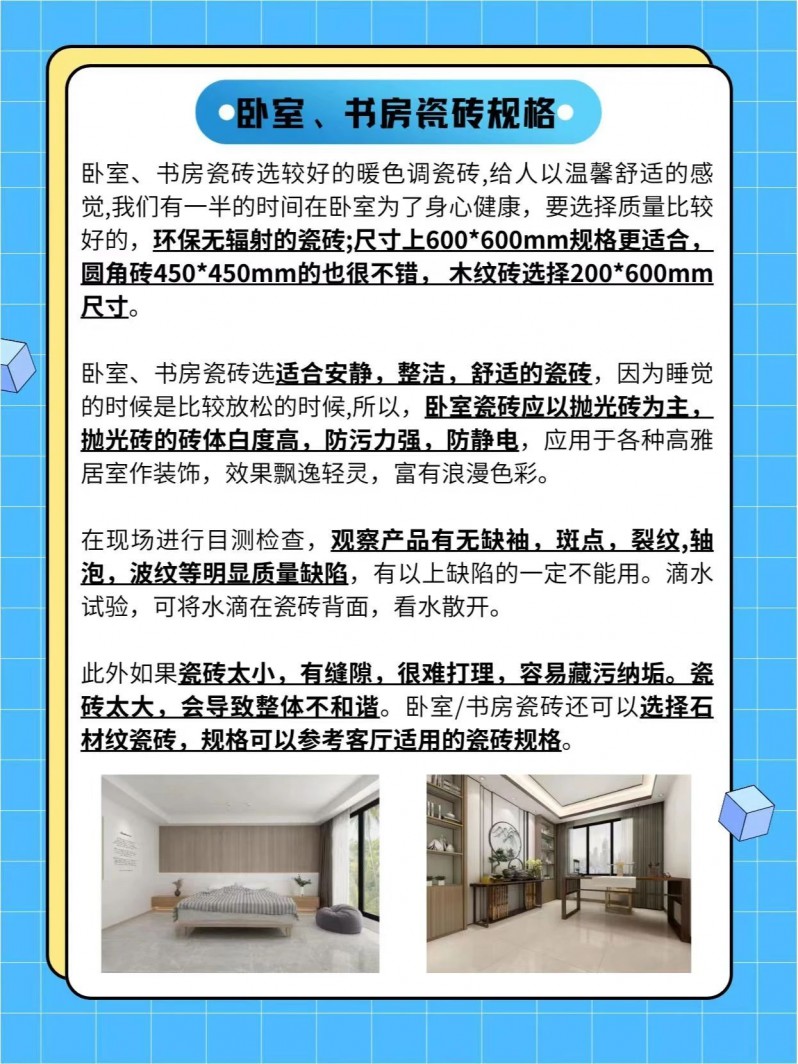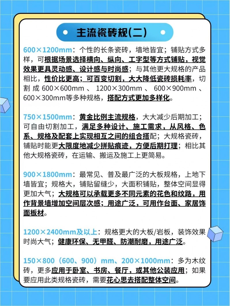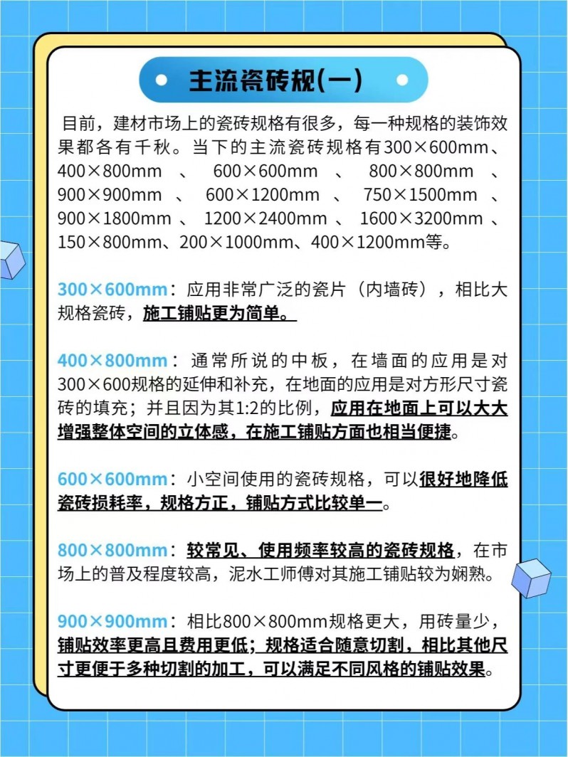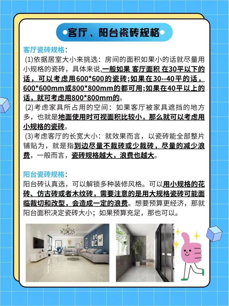 (4)瓷磚規(guī)格太大或太小可能會導(dǎo)致鋪貼施工本錢以及運(yùn)輸搬運(yùn)本錢增加。
