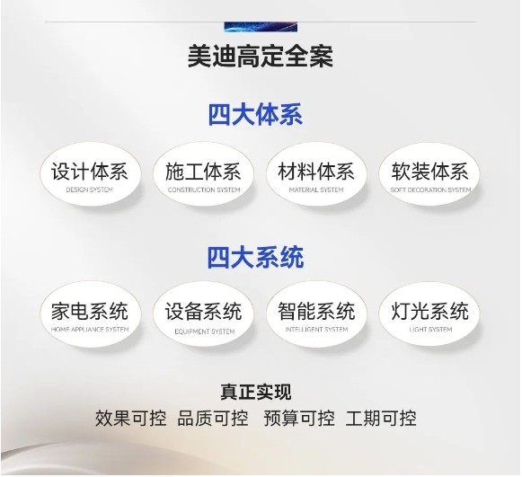 美迪高定全案服務(wù)模式,設(shè)計(jì)師帶頭進(jìn)行空間全案落地實(shí)施,保障軟硬一體化,更能貫徹設(shè)計(jì)的統(tǒng)一思想,保證設(shè)計(jì)風(fēng)格統(tǒng)一、配色合理、空間有序,業(yè)主不再擔(dān)心裝完與圖片不符,最大程度保證設(shè)計(jì)落地還原度。真正實(shí)現(xiàn)效果可控、品質(zhì)可控、預(yù)算可控、工期可控。