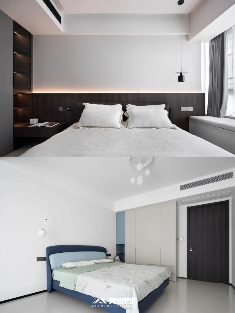 以低飽和奶白、淺灰為基底,局部嵌入胡桃木色的溫潤與金屬線條的細(xì)膩,用材質(zhì)碰撞替代繁復(fù)紋樣:客廳懸浮電視柜與墻面齊平,僅以弧形落地?zé)酎c(diǎn)睛;主臥背景墻采用微水泥肌理,搭配無主燈設(shè)計(jì)弱化裝飾痕跡。定制柜體與墻面無縫銜接,暗拉手、按壓式開合設(shè)計(jì)藏起生活雜物,讓空間始終清爽有序。