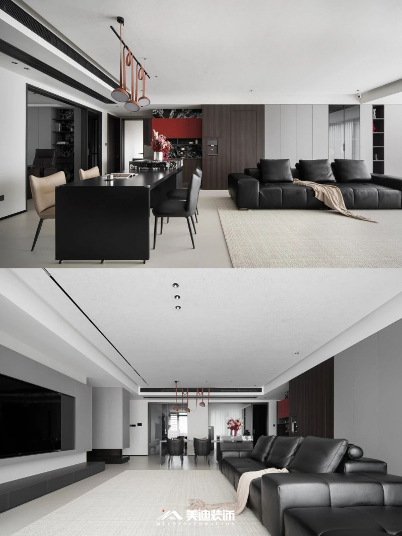 打破傳統(tǒng)墻體桎梏,采用 “LDK 一體化” 設(shè)計(jì)串聯(lián)客廳、餐廳與廚房,視線從入戶直抵陽臺,無阻隔動線適配多人互動,讓 194㎡的開闊感充分釋放。同時借懸浮吊頂?shù)膶哟蝿澐?、矮柜與地臺的隱形收納,在保持簡潔的前提下清晰劃分功能區(qū),既規(guī)避大空間的空曠感,又讓每處角落承載實(shí)用價值。