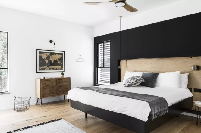 為了增加更多的舒適度,臥室區(qū)域的用色和材質都變得更加溫和。水泥地板換成了木質,水泥墻面被漆成了白色,雖然床頭只是一塊幾乎簡陋的木板,床架依然是黑色的鋼結構,但是卻不會顯得過于冷清剛硬。