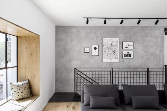 最特別的部分當屬這個向陽的“偽”飄窗不可,通過在厚實的水泥墻體里獲得的開口,成為了女主人午后消(文)遣(藝)的最佳去處。金屬的窗架,木質的內襯,窗外的樹木在陽光下生輝,室內白墻框出來的女主人如同入畫一般。