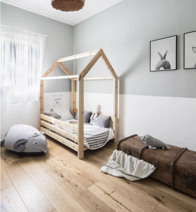 兒童房的設計則是運用到了別處沒有的粉嫩橄欖綠和卡通造型的家具,連相框里的圖案也換成了可愛的兔子。