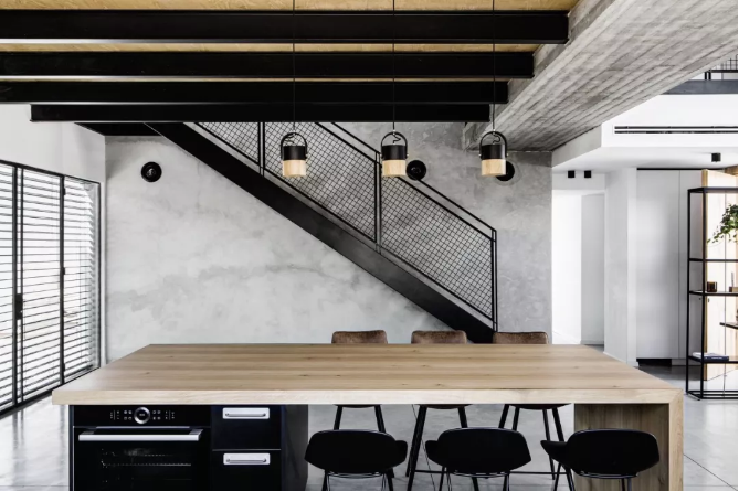 這是一套220平的別墅,業(yè)主是一對30出頭的年輕夫妻,有一個可愛的娃娃和一條可愛的狗狗。喜愛工業(yè)風的他們大面積采用了水泥材質裝修,搭配上鐵材質和木材質,組成了家中家裝的三色基調,設計打破了常規(guī)的工業(yè)風裝修。