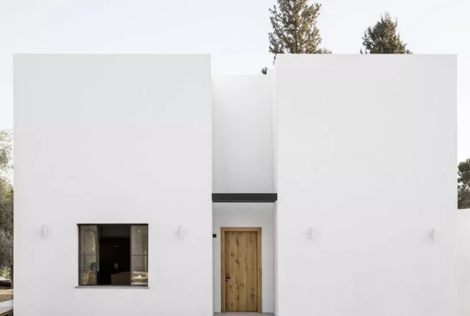 室外設計簡單明了,素白的立面上,只有幾扇窗戶在陽光下閃耀,投影著對面樹木的枝椏。