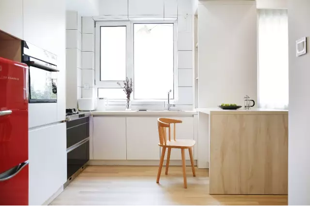 整體櫥柜與純白的整體空間融為一體,簡(jiǎn)約而有品位,紅色冰箱采用了內(nèi)嵌式設(shè)計(jì),為視覺(jué)帶來(lái)強(qiáng)大的沖擊力。