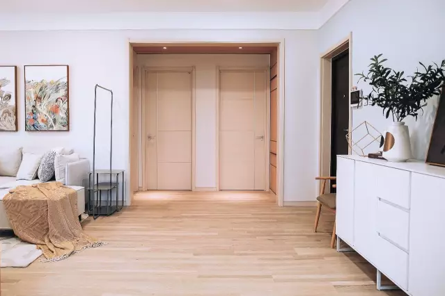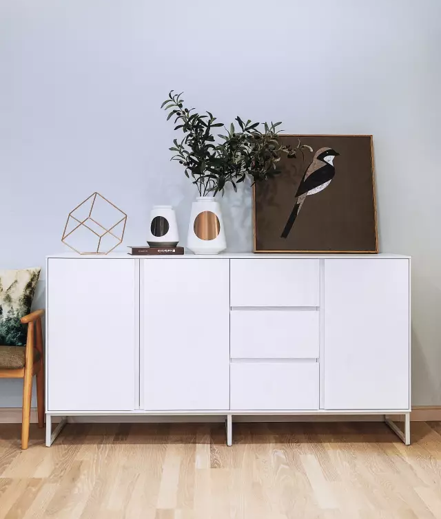 入戶左側(cè)有一個(gè)通體白色的玄關(guān)柜,用來(lái)收納鞋子或其他日常物品,簡(jiǎn)單又實(shí)用,大大保證了門(mén)廳的整潔美觀。