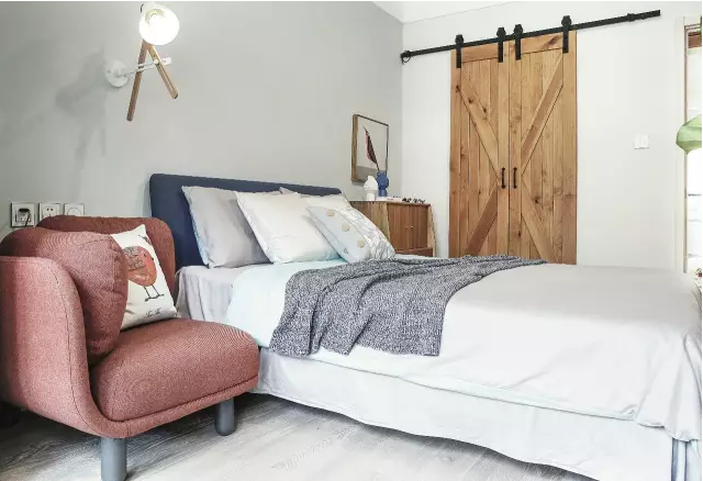 谷倉(cāng)門(mén)里面藏了一個(gè)嵌入式衣柜,足以滿足業(yè)主強(qiáng)大的收納需求,門(mén)一關(guān)上也不會(huì)影響臥室的視覺(jué)感,反而讓這扇門(mén)成了一件不錯(cuò)的裝飾。