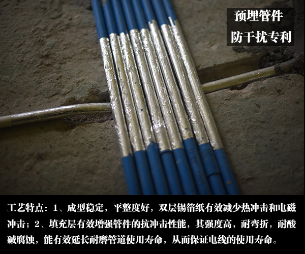 預(yù)埋管件防干擾專利實(shí)用新型成型穩(wěn)定,平整度好、利用雙層錫箔紙光潔度和熱反射性有效減少外界環(huán)境以及交叉管線對(duì)管道的熱沖擊和電磁沖擊,同時(shí),其內(nèi)填充的石英砂和CPVC支撐管能有效增強(qiáng)管件的抗沖擊性能,其強(qiáng)度高,耐彎折、耐酸堿腐蝕性能優(yōu)越,能有效延長耐磨管道的使用壽命,進(jìn)而保證其管道內(nèi)纜線的使用壽命。