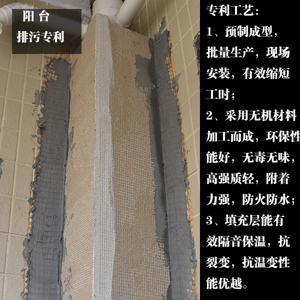 實(shí)用新型的預(yù)成型排污管外管為預(yù)制結(jié)構(gòu),可進(jìn)行批量化預(yù)制以方便在裝修現(xiàn)場(chǎng)成批安裝,有效縮短了裝修工時(shí)。同時(shí),由于采用無機(jī)材料板作為基板進(jìn)行加工制作而成,其環(huán)保性能好、無毒無味、高強(qiáng)質(zhì)輕、膠面附著力強(qiáng)且防火防水,配合玻璃纖維填充層能有效隔音保溫,同時(shí)抗裂變、抗溫變性能優(yōu)越,可廣泛應(yīng)用于廚房煙道、衛(wèi)生間、陽臺(tái)排污管道,消防管道包裝。