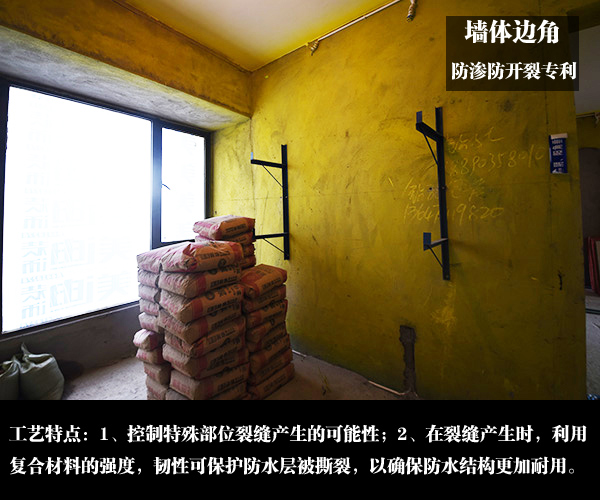 實(shí)用新型的防滲防開裂墻體邊角結(jié)構(gòu)施工方便,周期較短,可在施工完成后對(duì)墻體邊角位置進(jìn)行包裹保護(hù),控制墻體邊角位置的裂縫產(chǎn)生的可能性,同時(shí)在裂縫產(chǎn)生時(shí)利用復(fù)合材料層進(jìn)行連帶加固保護(hù),復(fù)合材料層的韌性可保護(hù)防水層在較大強(qiáng)度下不被墻體裂縫撕裂,以確保防水結(jié)構(gòu)更加耐用。