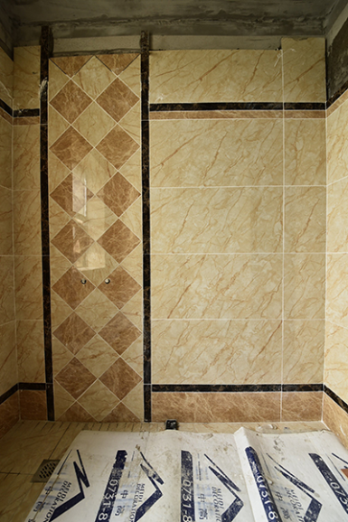 細節(jié):洗手間里已經(jīng)貼好了瓷磚,衛(wèi)生間與水接觸最多,所以在衛(wèi)生間鋪磚,就必須重視防水和防潮。啞光面或者是帶有凹凸造型的瓷磚是最佳選擇,其目的是防滑。其次,還要注意衛(wèi)生間的地面應低于其他房間的地面10~20毫米。通常情況下衛(wèi)生間地磚的鋪設保留1%的漏水坡度,地漏處最低,以利于排水。地磚接縫要粗細一致,與墻磚縫對齊。