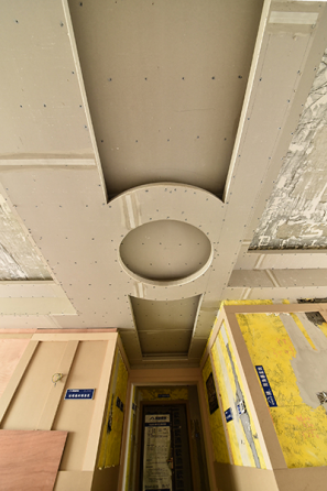 細節(jié):過道異性吊頂。七字行,就是像阿拉伯數(shù)字7一樣,橫豎有連筆成一體的樣式。七字行吊頂,就是在吊頂拐角處的兩個角,用一整張板材做成,這種結(jié)構(gòu)可以最大程度保證吊頂結(jié)構(gòu)穩(wěn)固,其表面的裝飾材料不易開裂,鼓起,脫落。